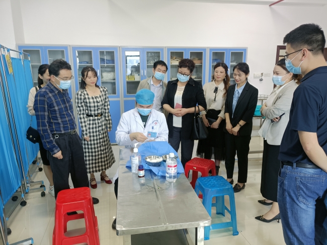 院长颜建辉对石国勇一行的到来表示热烈欢迎,并陪同调研组参观了我院临床技能中心。石国勇详细了解了临床技能中心的设施设备,在校学生、住培学员对实训室使用情况,对我院在医学人才培养工作上取得的成绩表示了充分肯定。在外科实训室,石国勇饶有兴致地观看了住培学员“外科打结”临床技能基本功训练,住培学员练习娴熟,手法规范,石国勇频频点头表示满意。石国勇处长还对临床技能中心“中医标本馆”琳瑯满目的中药标本表示了浓厚的兴趣,仔细观赏,驻足良久。