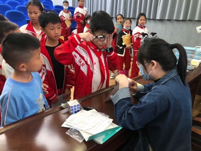 课后,工作人员拿出事先准备好的验光仪器、视觉训练工具、眼球模型等器材,为孩子们演示如何用仪器测试、训练眼睛,通过理论与实践相结合的方式,带领同学们体验科学的检查及训练方法,探索眼睛的奥秘。活动形式深入浅出、寓教于乐,让同学们对爱眼护眼产生了浓厚的兴趣。