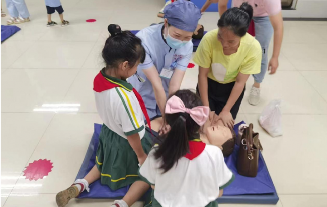 首先,袁斌云为大家进行了防溺水知识讲座,使学生及家长对溺水的原因以及如何预防溺水有一个系统、全面的了解。接着,医务人员设模拟场景,指导学生进行求救、互救、自救的防溺水实践演练,还耐心讲解和演示了对溺水人员上岸后的急救处理方法。活动现场,师生及家长们兴趣浓厚,大家踊跃参加、亲身体验,掌握了心肺复苏等急救技能。“湘南学院附属医院的医务人员来学校开展此次培训,有效提高了在校师生的急救意识和应急能力,同时更加认识到‘安全无小事,事事有安全’,进一步增加了学生珍惜生命的安全意识。”第十九完小教师邱英说。