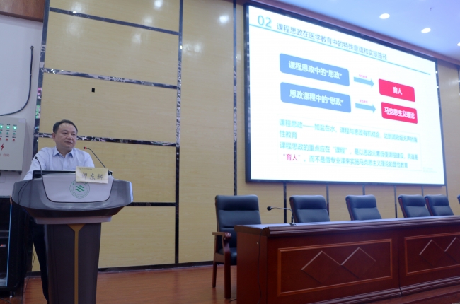 会上,谭东辉以“医学教育课程思政内涵与实践”为题,从课程思政的时代背景、课程思政在医学教育中的特殊意蕴以及医学专业中课程思政元素的挖掘和案例实践等方面展开了精彩的讲授。不仅加强了教师们对课程思政的认识,为课程思政建设提供了范例,开拓了思路,还为教师们将思政元素迁移到课程的教学设计中,真正落地在教学实践中,发挥“课程思政”培育时代新人的合力作用指引了方向。