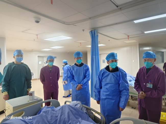 督导组一行对我院急诊科(急诊ICU)、呼吸内科、重症医学科进行了实地走访,对院内新冠病毒感染患者收治情况、药品储备及管理情况等进行了督导检查。督导组对我院在医疗资源调度、药品设备的保障、新冠患者的规范诊疗以及危重患者的救治能力和救治成功率等方面给予了充分肯定,并结合实际对我院新冠病毒感染医疗救治工作提出了指导意见和具体要求。