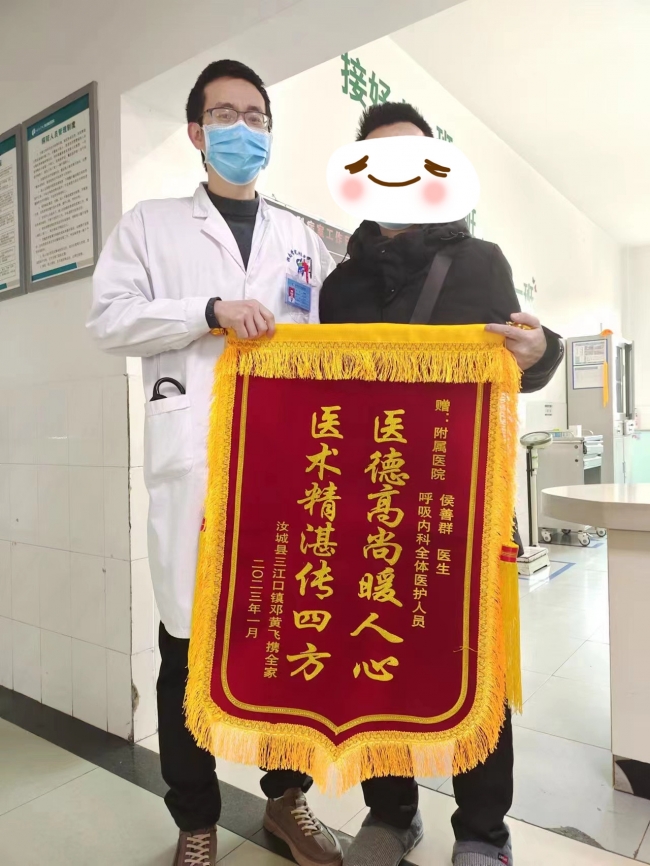1月28日,医患一家亲的一幕再次上演。呼吸内科重症新冠肺炎患者唐大爷要出院了,家人兴高采烈的与主管医师侯善群合影,并为他送上一面“医德高尚暖人心,医术精湛传四方”的锦旗。侯善群副主任医师腼腆地微笑着,清秀斯文的模样,让人很难想象这纤瘦的身板下隐藏着怎样巨大的力量。