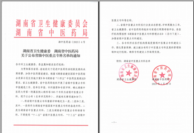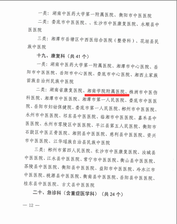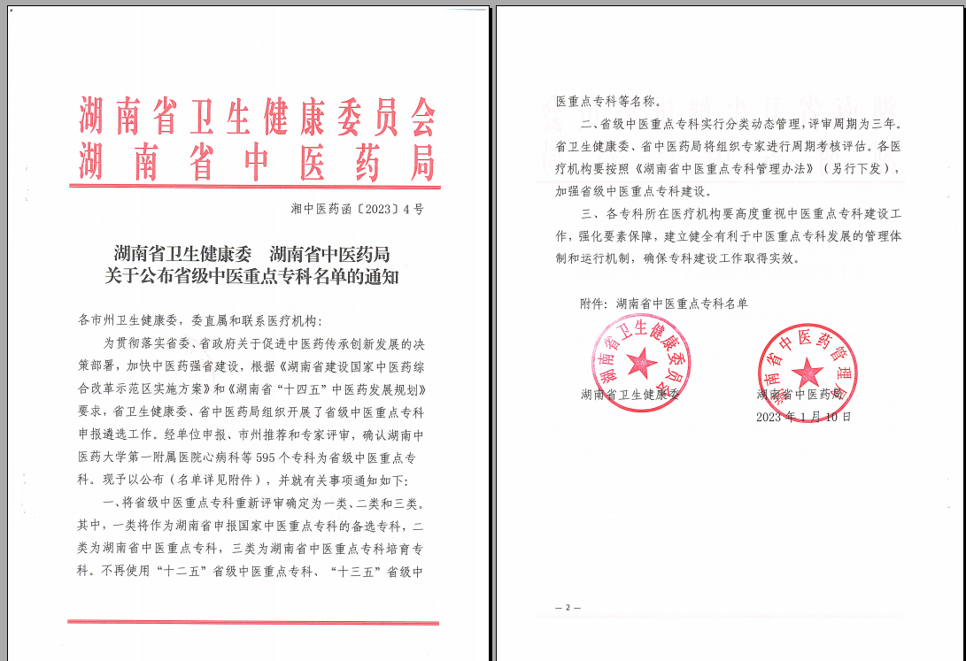 本网讯(通讯员 王敬)近日,《湖南省卫生健康委 湖南省中医药局关于公布省级中医重点专科名单的通知》(湘中医药函〔2023〕4号)公布了省级中医重点专科名单,湘南学院附属医院康复医学科确认为二类省级中医重点专科。