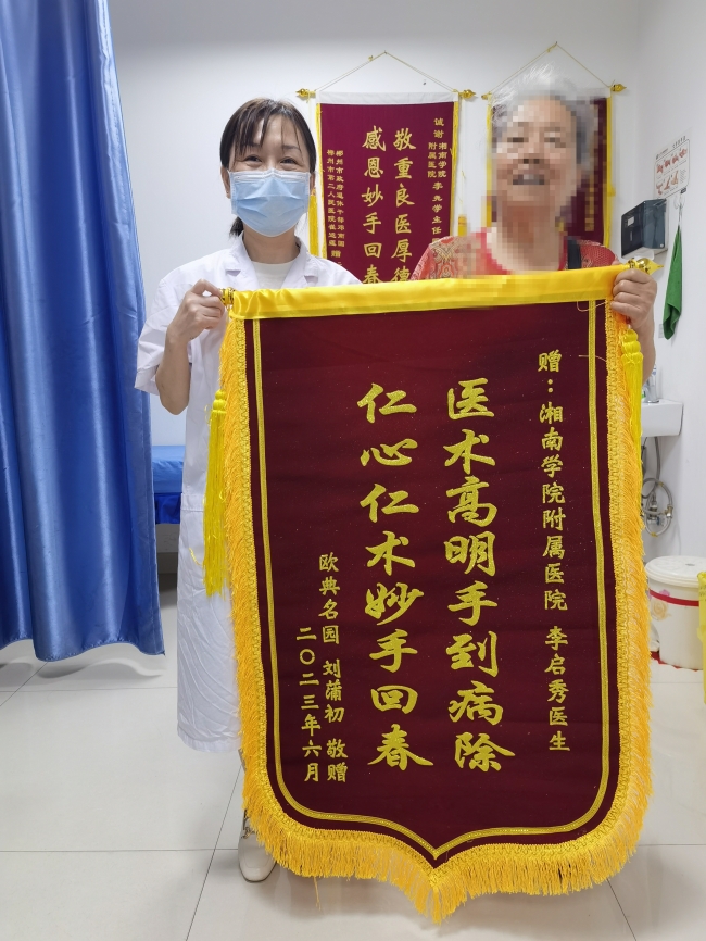 “我姓刘,今天特地来给李医师送锦旗,我是李医师多年的老病友了,有啥不舒服,我都找她看诊,李医师不但医术高明,药到病除,人也特别好,很细心,非常耐得烦,我患了多年的老慢支咳嗽四处求医也不见好转,四年前慕名来找到李启秀医师,五副中药就给我治好了,解除了我多年的困扰,生活质量有了明显改善,真的非常感谢她!我还介绍了不少熟人朋友来找李医师看病,都夸李医师好,其中一位70多岁的老大爷,他是资兴人,也是常年受咳嗽的困扰,吃不好睡不香,多家医院看诊,花了不少钱也没治好,我介绍他来找李医师看诊就给治好了,他逢人就说李医师好,李医师是我们最值得信任的好医师”。刘阿姨神情激动向我诉说着事情的经过与内心的感激。