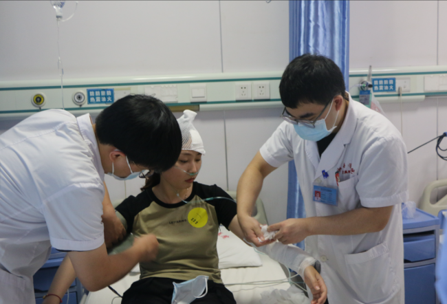 伤者到达医院,根据病情分级立即予以救治,其中病危伤员1人,昏迷状态,立即给心电监护、建立静脉通道,进行气管插管以呼吸机辅助呼吸,医务人员将患者送至CT室检查后收治EICU,病重伤员2人,头部外伤,右下肢开放性骨折,现场止血包扎加固定,完善CT检查,经多学科联合会诊后由急诊直接进入手术室行急诊手术,轻症伤员1人,多处软组织挫伤,于外科诊室消毒包扎伤口后完善检查,急诊留观。