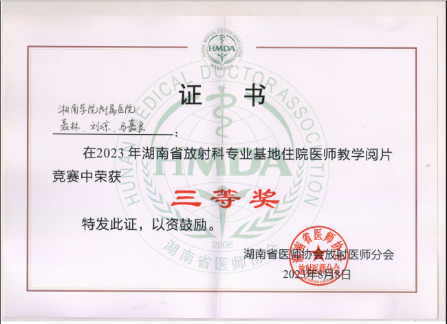 本网讯(通讯员 吴涛)2023年 8月11日,湖南医师协会放射分会2023学术年会在长沙举行,会上首次举办了住培教学阅片大赛,我院放射住培基地聂林副主任医师带领我院两位2022级放射科住院医师刘琼、马嘉良在上半区与湘雅医院等国内一流医院同台竞技,经过激烈的角逐比拼,最终在11支队伍中取得了第4名的佳绩,斩获三等奖。
