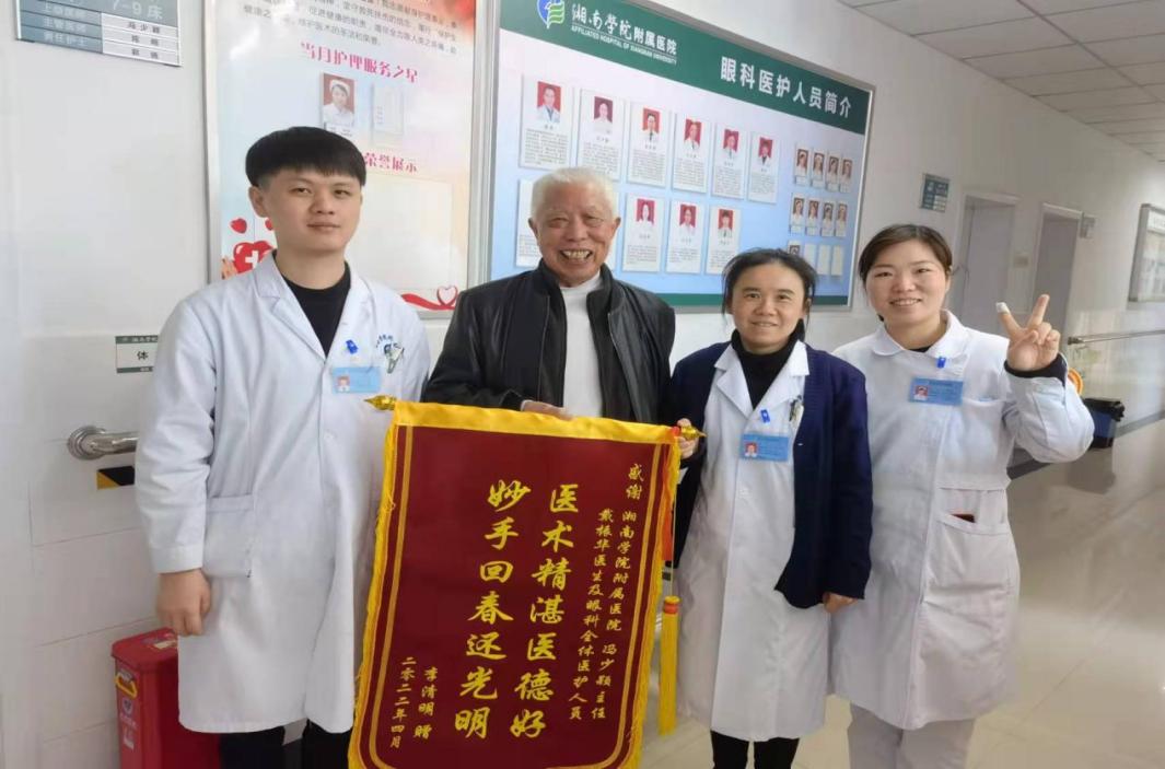 手术进行顺利,经过精心的术后护理,李爷爷重见光明,视力明显提高,眼压也恢复正常。4月1日出院前夕,李爷爷为眼科的医护人员送来了锦旗,高兴地说:“我终于看清你们的模样了!现在眼睛不痛了,头也不痛了,真是太谢谢你们啦!”