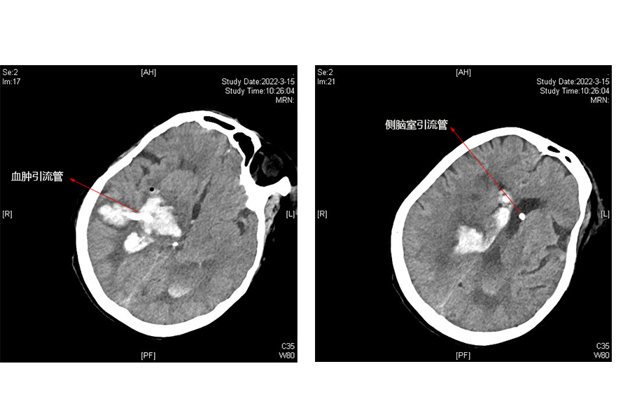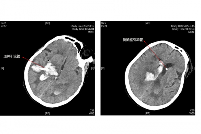 3月13日深夜,家住安仁县的李奶奶起床上厕所时突然感觉到左侧肢体无力,紧接着出现头痛、呕吐、意识障碍,家人紧急将她送往当地医院,行头颅CT检查显示:右侧基底节区脑出血并破入脑室,考虑病情凶险,出血量大,医生建议转入湘南学院附属医院进一步救治。