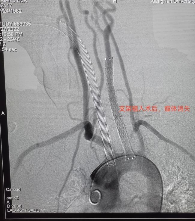 5月27日,在麻醉科协同下,李大姐在全麻下顺利接受了颈动脉瘤覆膜支架植入术。覆膜支架可以隔绝瘤体和血栓,从心脏发出的动脉血不会再冲进瘤体,瘤体破裂和血栓脱落的双重危险就此一举解除。