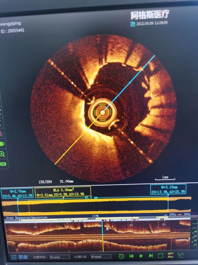 经心血管内二科介入团队充分讨论后,决定导丝通过病变后,先行冠脉OCT(光学相干断层扫描)检查,明确冠状动脉内病变处狭窄程度、斑块负荷、钙化等情况,再决定行下一步血运重建处理。李维军介绍,“OCT检查具有图像清晰、病变斑块识别良好等特点,可呈现出冠状动脉内部三维真实情况,对比以往用肉眼观察冠脉造影二维图像,或者冠脉超声检查对血管内特殊病变的斑块识别等,都更为清晰及准确,就像在血管内放入一个“高清电子眼”,能有效保障冠脉内血运重建术的成功率,降低支架内再狭窄风险。”