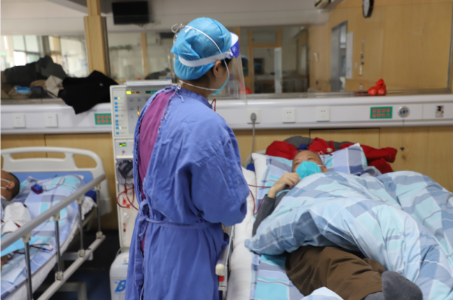 患者8小时的血透治疗背后,是医护人员冲锋在前不畏感染风险,坚守全程24小时的一对一看护。