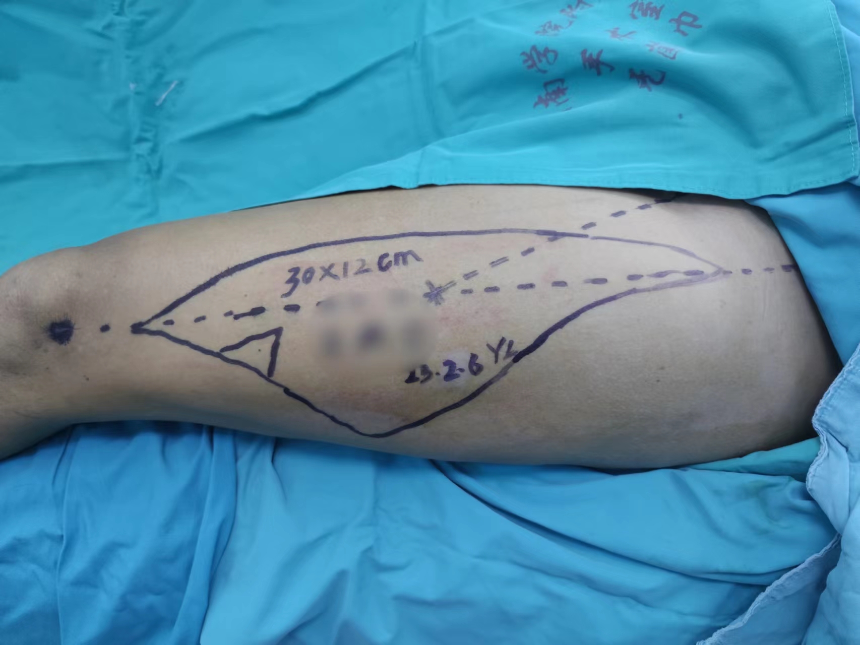 皮肤软组织缺损伤在临床较为常见,多见于创伤、感染及肿瘤切除术后,临床处理非常棘手,尤其是一些复合组织缺损、骨外露创面,单纯游离植皮难以成活,即使成活也很容易形成贴骨瘢痕影响功能。“王先生由于损伤重,肌腱、骨质外露多,皮肤软组织缺损面积大,同时大拇指损伤严重,术中还需重建拇指功能,手术难度大。”袁岭医生介绍,“我们首选的修复用皮瓣就是被誉为“万能皮瓣”的股前外侧皮瓣,因为股前外侧皮瓣可以被设计成不同形状修复不同创面,且可取面积大,为临床应用最为广泛的皮瓣之一。”