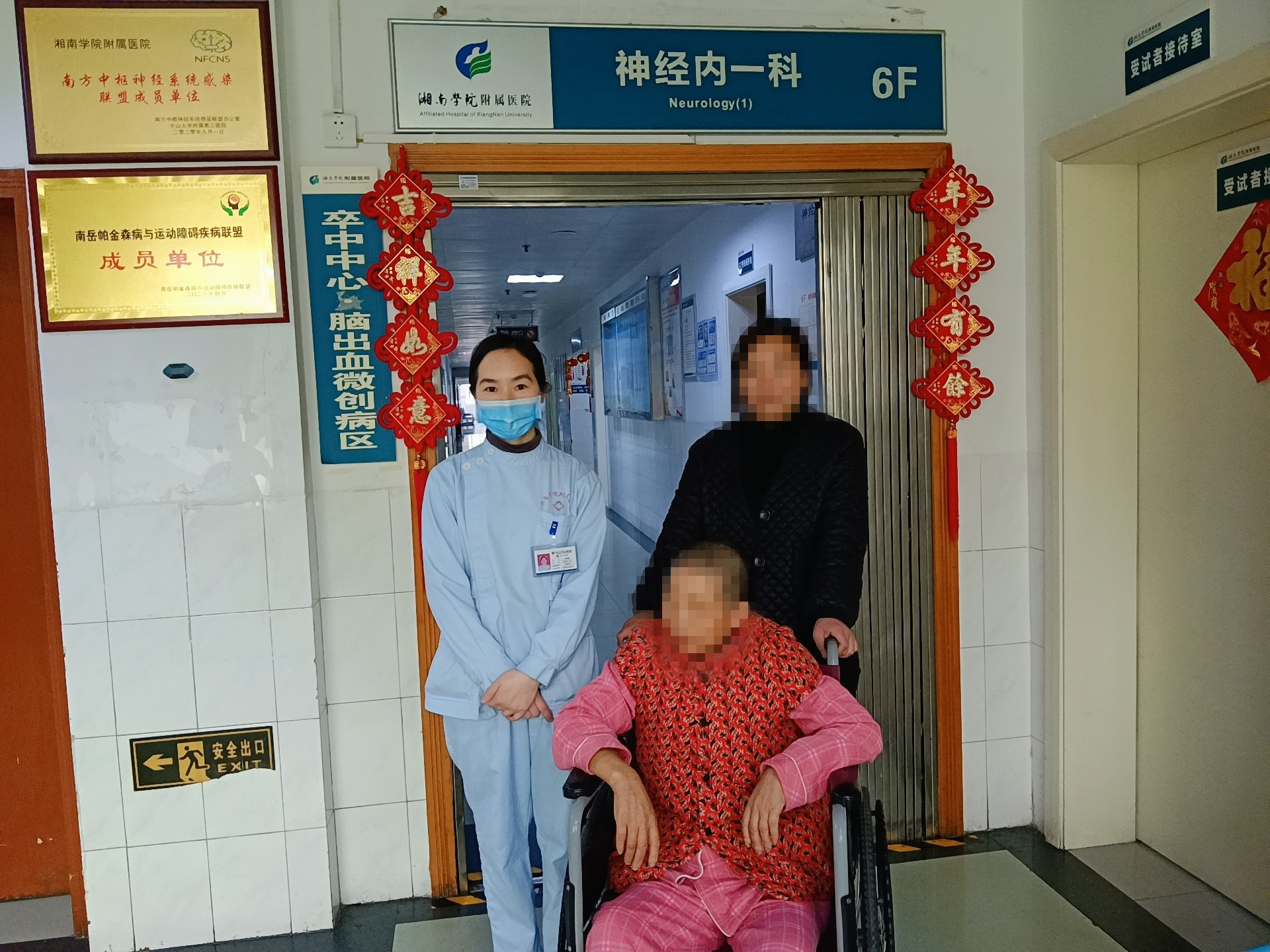杨阿姨来自山东济宁,在郴州资兴市工作的时候突然头晕、呕吐、肢体无力,意识不清,陷入了昏迷,由120紧急送入湘南学院附属医院治疗。当时CT提示右侧大脑半球大面积脑出血,诊断为急性脑出血,考虑脑疝形成,中线移位,如不及时救治杨阿姨随时都有生命危险。主管医生李宜军立即联系副主任医师何正初在急诊下为患者实施了颅内血肿穿刺引流术。手术完成后,治疗效果立竿见影,患者神志立即改善,肢体活动明显好转,术后予以脱水降颅压,抗感染,止血,血肿冲洗等治疗后,血肿基本吸收,四肢活动也基本恢复正常,现在已经达到出院指征。考虑到杨阿姨家在山东,远隔千里,生活上多有不便,在她住院治疗期间,神经内一科全体医务人员都尽可能的为她提供方便,给予患者更多的关怀与照顾,湘南学院附属医院高超的诊疗技术和温馨的医疗服务,都让杨阿姨和家人感动不已。