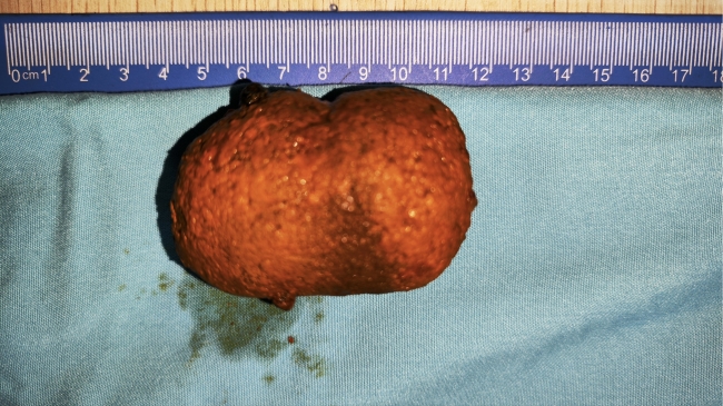 经过缜密的术前讨论和评估,医务人员为蒋阿姨做好了万全的准备。手术当天,经验丰富的肝胆外科医生团队配合默契,为蒋阿姨实施腹腔镜下中转开腹肝叶部分及肝门部胆管病损切除联合肝内胆管切开取石、胆总管胆管整形术、胆管空肠吻合重建术。术中可见,患者原来的胆肠吻合口处炎性狭窄,医生操作十分谨慎,经过5个小时的精细手术,“巨石”终于被取出,重新疏通胆汁流出道,手术十分成功!术后,取出约8公分大小的结石。彭钊说,“一两公分的结石比较常见,这么大的胆石在临床上确实非常罕见,也严重影响了患者的健康和生活质量。”