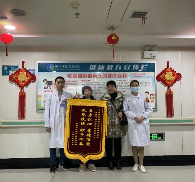 3月25日,曹阿姨带着一面鲜红的锦旗,在女儿的陪同下,冒着瓢盆大雨,特地从耒阳赶来医院。她紧紧的握着王栋洋医生的手,饱含泪水激动地说:“谢谢你们,是你们给了我一次重生的机会,是你们精湛的医术和医者仁心让我得到了最及时有效的治疗,感谢你们无微不至的关怀和护理 。”