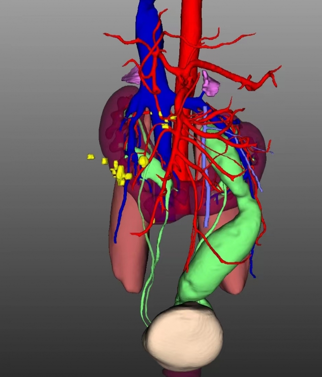 面对邹先生异于常人的马蹄肾,唐建生立即组织泌尿外科团队进行病例分析讨论,完善相关检查,结合CT和3D影像学检查,清楚的显示双肾盂输尿管畸形,其中左上位肾的输尿管全程明显扩张,左上位输尿管异位开口于前列腺,其排便改变与异位输尿管开口及扩张的输尿管刺激有关。经过详细周密的手术方案设计,医务人员决定通过微创手术为邹先生解决病痛。