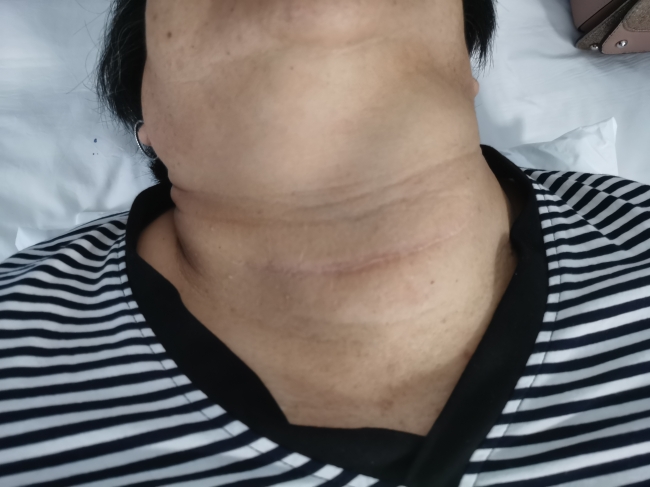 面对这重重困难,如何保障患者术后治疗效果?如何保障患者术后生活质量不受影响?这是接诊李阿姨之后,医务人员一直在思考的问题。在李仁喜主任的组织下,乳甲胸外科联合麻醉科、呼吸内科和肿瘤科等相关科室,进行术前多学科联合会诊,为李阿姨制定了严密的手术方案及相关紧急情况处理措施。6月20日,李仁喜团队顺利为李阿姨实施了手术。术中,为了不误伤神经和甲状旁腺导致患者失声,医务人员用纳米碳显影后,聚精会神地将甲状旁腺和神经组织分离开,又小心翼翼地切除李阿姨左侧的巨型甲状腺肿瘤。手术顺利完成后,主管医生周锋平一直守在麻醉复苏室,等病人清醒后,确保病人发声是正常的,才将病人送回病房。经过几天时间的恢复,李阿姨康复顺利,无任何并发症发生,现已出院。