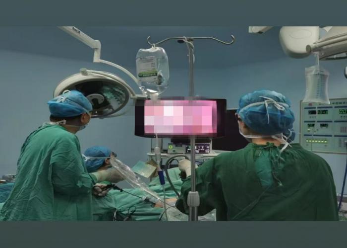 2025年5月19日,唐梅艳团队为薛阿姨实施子宫肌瘤剥除术及子宫骶韧带高位悬吊术。术中置镜检查发现,子宫增大如孕 3 + 月,剥离出前壁肌壁间肌瘤大小约 12*10cm,包膜完整,其内有淡黄色囊液。手术团队顺利取出子宫肌瘤,并完成子宫骶韧带高位悬吊术。