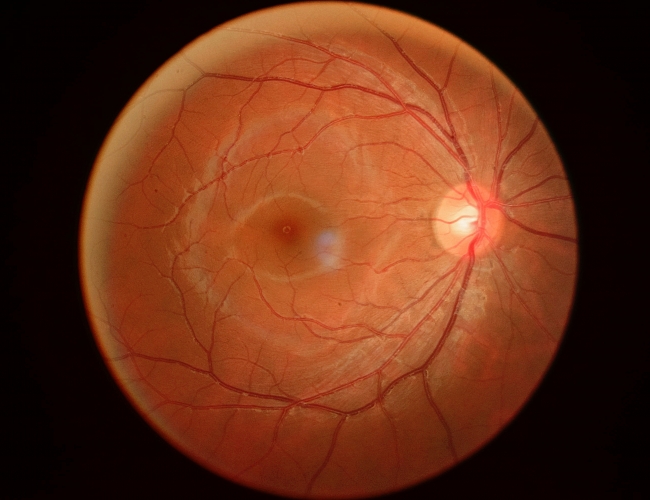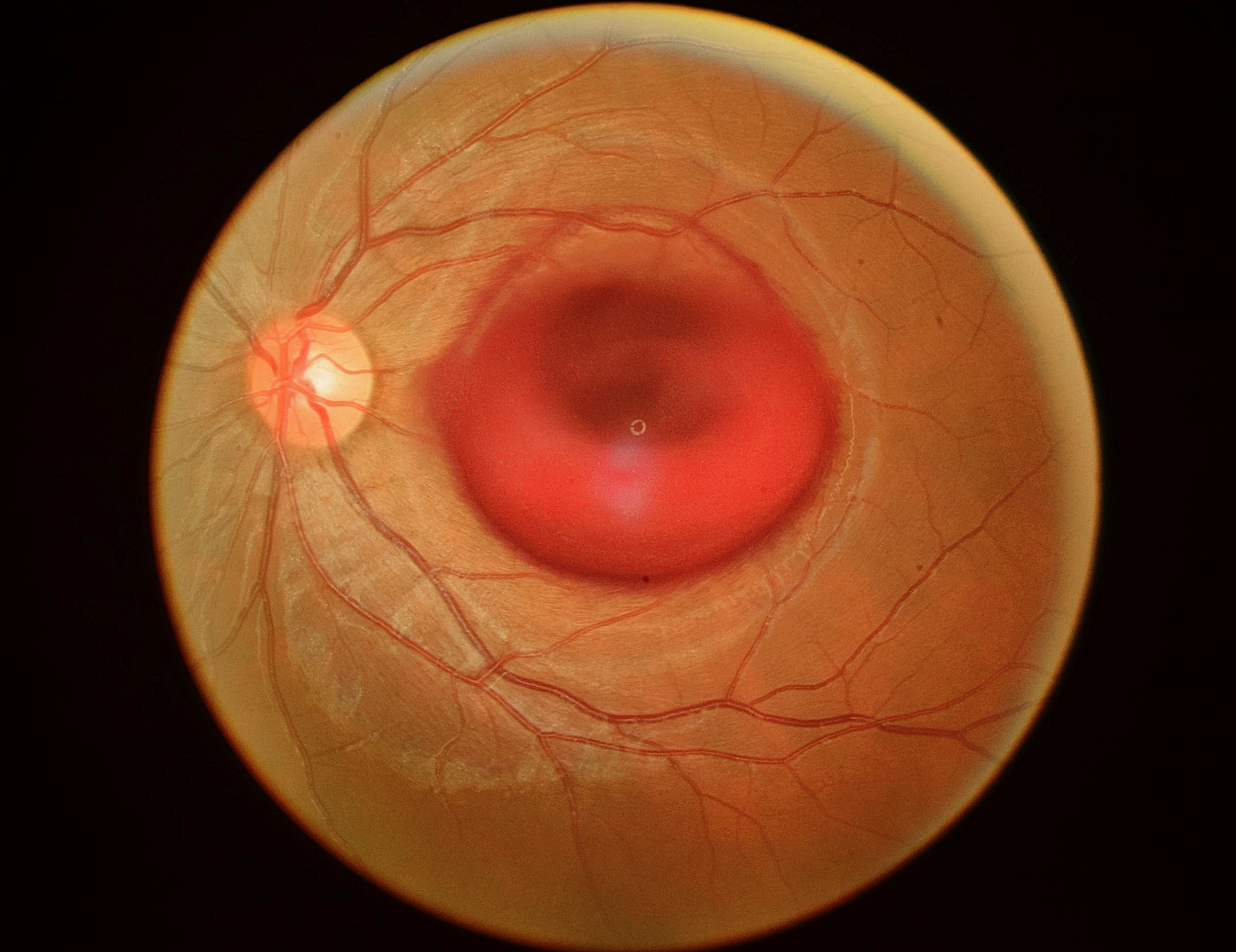 由眼底彩照图像可以看见,左眼视网膜出血量大,由于积血的遮挡,邓同学左眼视力骤降,几乎等同于失明。这可把邓同学和他的家长急坏了。