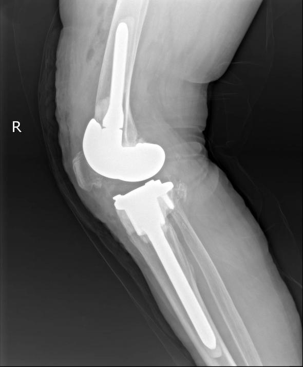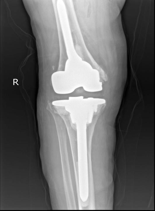 69岁的李大娘家住郴州嘉禾,2012年因膝骨关节炎在外院行右侧全膝关节置换术,3年前开始出现右膝关节疼痛,上下楼吃力,下蹲困难,伴活动受限。近期以来,右膝活动受限加重,走路需拄拐,在当地医院就诊,诊断为右膝关节置换术后假体松动。