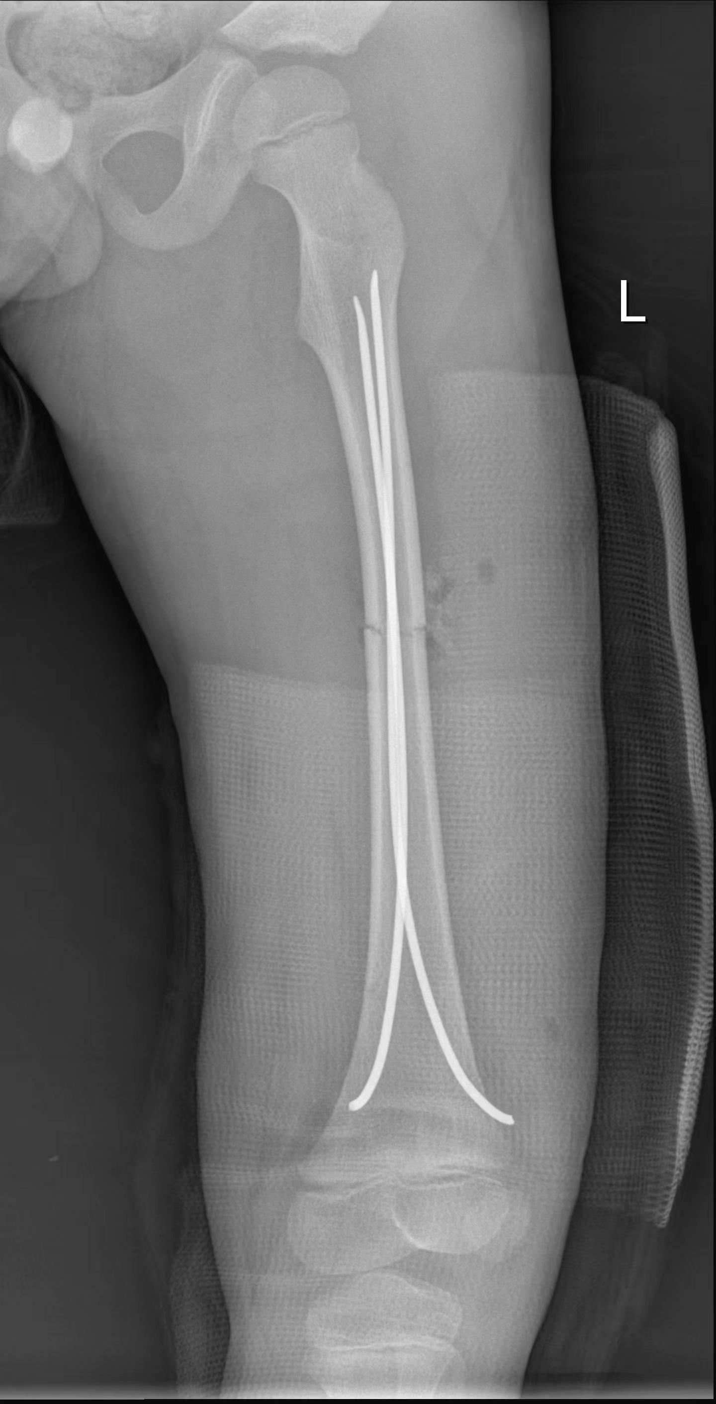 完善各项术前准备工作后,在李杨主任指导下由袁岭副主任医师主刀,开始为患儿实施左股骨干骨折微创撬拨复位弹性髓内针内固定手术。术中,医生通过股骨远端两个约1cm手术切口,将两枚弹性髓内针精准置入股骨髓腔内,顺利完成了复位和固定。乐乐骨折部位仅留下一个直径约0.5cm大小的撬拨复位通道,手术时间短,术中出血量极少,术后骨折即刻得到稳定,在半髋肢具或石膏保护下,术后患肢很快就能进行不负重功能训练,护理非常方便,复查骨折断端对位对线良好,畸形纠正。全家人都对湘南学院附属医院骨二科团队感到非常满意,乐乐顺利康复出院的当天,乐乐奶奶对医务人员激动地说:“我孙子是不幸从楼上掉下来,幸运的是碰到了这么优秀的医师团队,真的非常感谢您们!”