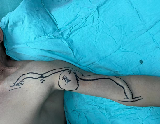 戴洪波主治医师接诊到肖大爷后发现,患者左上肢上臂肿大,有一个鸡蛋大小的 “肿块”,同时还伴有瘘静脉曲张,局部压力高,搏动感明显,以及明显的疼痛感,超声证实为瘘静脉破裂之后假性血管瘤形成,同时还存在瘘静脉流出道狭窄,瘤体随时都有破裂大出血的风险,需要尽快手术处理,恢复血液透析通路功能。戴洪波立刻将情况报告了肾内科主任黄存军,并组织科内讨论,最终决定为肖大爷实施左上肢假性动脉瘤切除术+动静脉内瘘修补术+静脉球囊扩张术。