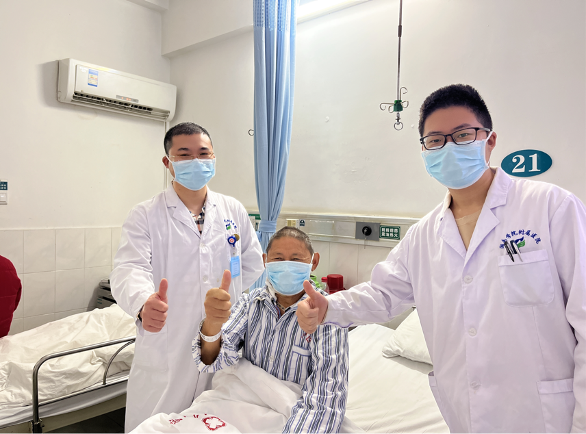 为了降低手术风险,手术医生认真为患者考虑了每一个有可能出现突发情况的手术细节,并且提前制定应急预案,做好了万无一失的准备。手术当天,医务人员配合默契,操作娴熟,成功为肖大爷实施了手术,术后扪及血管震颤明显。肖大爷内瘘血管资源被保护得很完美,术后他依然可以正常进行血透治疗。“在我们当地医院,都说血管瘤破裂的风险很大,当地医院都不敢做这个手术,是湘南学院附属医院帮助了我。”术后,肖大爷高兴地说,“我觉得手术后内瘘震颤及杂音都很好,摸得很明显,手术切除血管瘤后,我的左上肢的内瘘部位“肿块”消失了,也不疼了,湘南学院附属医院的手术做的非常好,这里的医生技术水平很高!” 经过医务人员的精心照顾,肖大爷很快康复。出院当天,他亲切地与医务人员合影,在镜头前激动地竖起了大拇指。
