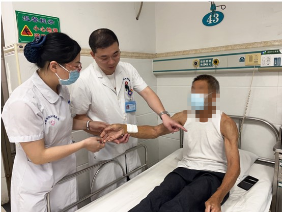 临武县麦市乡的郭大叔今年61岁,患有尿毒症10年,10年来郭大叔一直行维持性血液透析治疗,期间因内瘘功能不良行了三次手术治疗,此次因左上肢动静脉内瘘(转位内瘘)闭塞来到湘南学院附属医院。“我手上的动静脉内瘘已闭塞一个多月,做不了血透,听老乡说戴医生为很多人解决了内瘘的问题,特地从县城赶车过来找他处理。”抵达医院后,郭大叔第一时间找到肾内科戴洪波副主任医师。