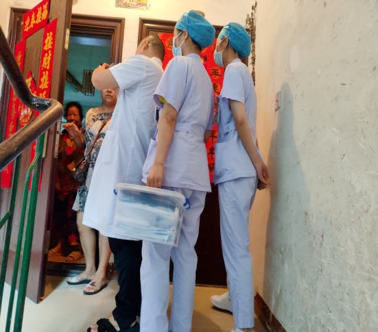 段小霞一边安抚家属情绪,一边向科主任欧立文及医务部汇报,与唐爷爷家人联系好上门时间后,立即安排雷龙芳、聂钉钉两位护士与唐爷爷的主管医生曾宪兵一起,为患者开展了“上门服务”。