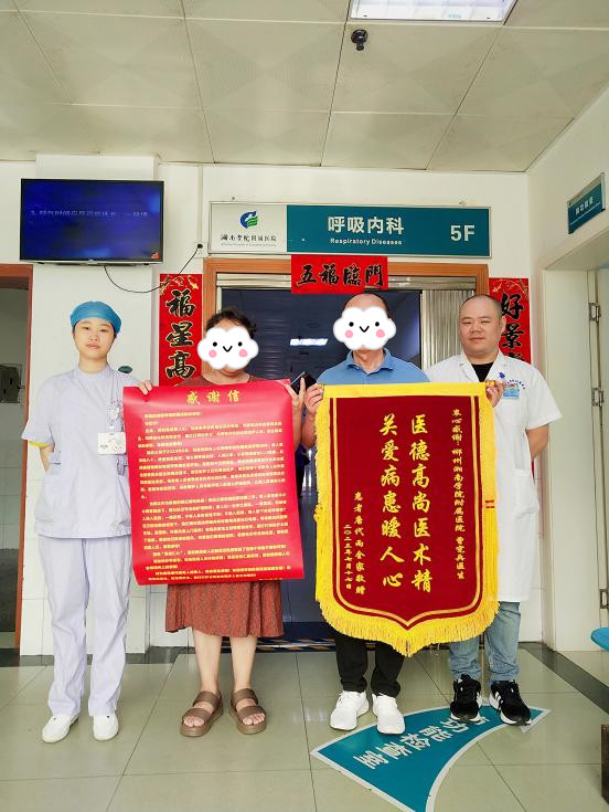 7月18日,家属特意送来了锦旗和感谢信,激动地说,“胃管拔出之后,我们全家人一筹莫展,只能尝试给护士长打电话,万万没想到的是,呼吸内科医务人员不辞辛苦上门服务,曾宪兵医生带着雷龙芳和聂钉钉两位护士来到了我家。看到他们熟悉的面孔,听着他们温情的话语,享受到他们专业的医疗服务,我们全家人都非常感动。湘南学院附属医院是真正以患者为中心的好医院。”