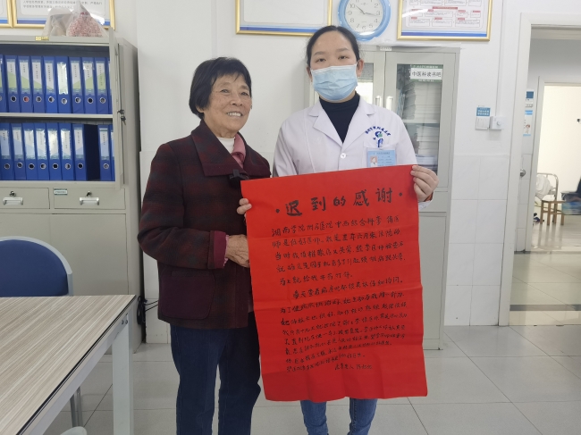 因陈奶奶年事过高,家中亲人平时都不让她一人出门,今天,她趁体检间隙,才能将这封迟到的感谢信送来,了却自己一桩心愿。对此,李婧医生也是感动不已。她说,“这封感谢信,是老人对我们医务人员的认可,也是对我们工作的鞭策,让作为医务工作者的我们更能深刻理解医生这份职业的价值和意义,也更激励我们在专业领域上精益求精,为更多的患者解决病痛。”