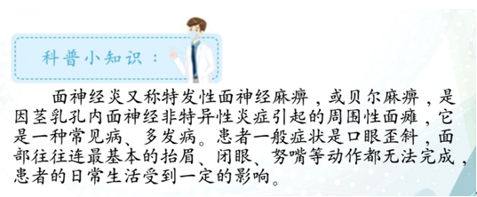 “接诊到王先生的时候,他的症状很明显,右侧额纹消失,右眼不能完全闭合,并露出角膜下的白色巩膜,右侧不能皱眉,露齿时口角向左侧倾斜,不能做鼓腮动作和吹口哨动作。”湘南学院附属医院康复医学科主任刘松涛说,“这也是面神经炎发病时最常见的表现,随后科室医务人员立即为其制定了针对性的治疗措施。”