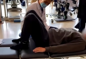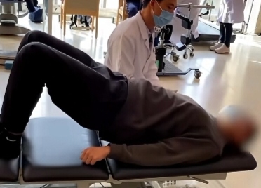 第二步,让患者慢慢地抬起臀部,维持一段时间后慢慢放下。