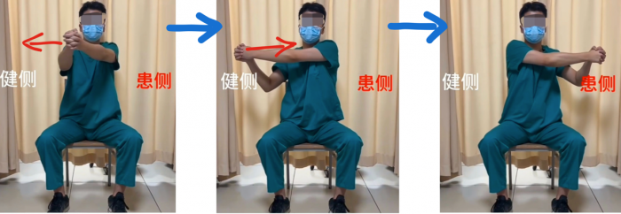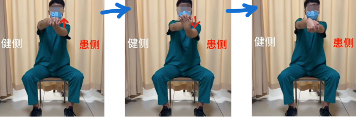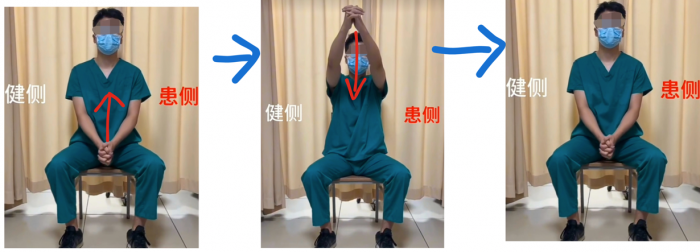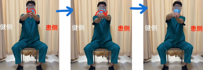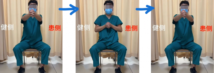 患者可取坐位或仰卧位进行练习,患者用健侧手握住患侧手,双手掌心相对,十指交叉握手,患侧拇指在上。然后健侧手带动患侧手做下列五个动作,每个动作做3组,每组15个: