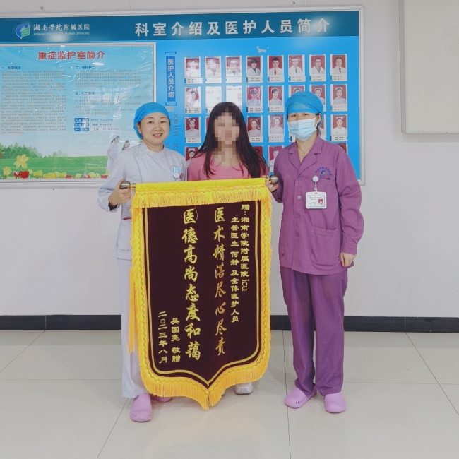 8月25日,吴爷爷家人再次来到重症医学科,给主管医生何静带来了吴爷爷居家休养期间身体状况稳定的好消息,并用一面鲜红的锦旗向全体医务人员表达了他们最真挚的感谢。