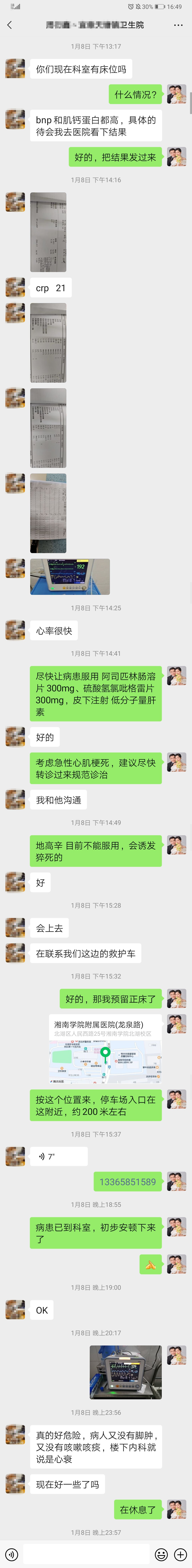 本网讯(通讯员 李虎)近日,郴州市宜章县的谷先生反复胸痛、呼吸困难到当地卫生院就诊,给予常规药物治疗后,症状却并无缓解,卫生院主管医生立即求助于湘南学院附属医院心血管内二科李虎主治医师,在手机微信里上演了一场横跨百余公里的隔空急救。