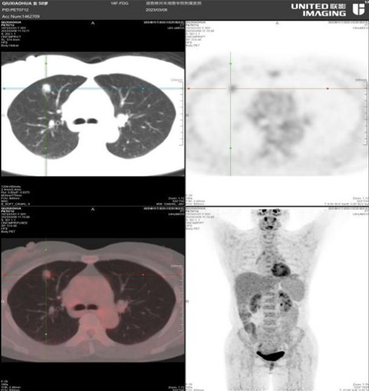 PET-CT检查结果出来后,提示右肺癌可能性大,王女士转入湘南学院附属医院肿瘤科进行系统治疗,随后通过术后病理检查确诊为右肺腺癌。正因为经过早期的精准筛查和诊治,王女士术后恢复顺利,现已康复出院。