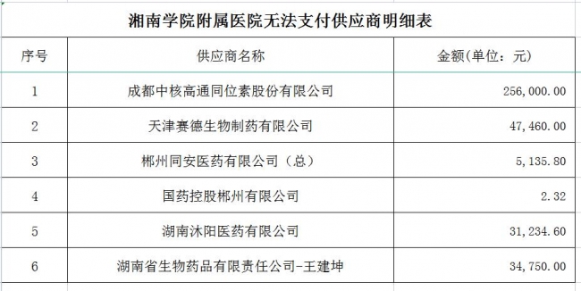 根据《郴州市2020年基本医疗保险基金审计的审计报告》要求,对医院供应商货款进行清查,清查发现,成都中核高通同位素股份有限公司、天津赛德生物制药有限公司等6家供应商货款,因原供应商公司已注销或因长期无业务往来无法联系,导致无法支付。现将供应商及货款明细进行公示(见附件1),请以上供应商在公示期间与我院取得联系,逾期我院将根据院长办公会会议决议,进行账务核销处理,若后续相关供应商提供相应证明,我院再核实支付货款。
