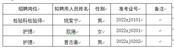 根据《湘南学院附属医院2022年面向抗疫一线编外医务人员公开招聘公告》及有关规定,经报名、资格审查、考核、体检、考察等程序,经医院党委会研究,确定姚紫宁等3名同志为2022年湘南学院附属医院面向抗疫一线编外医务人员公开招聘拟聘用人选,现予以公示。