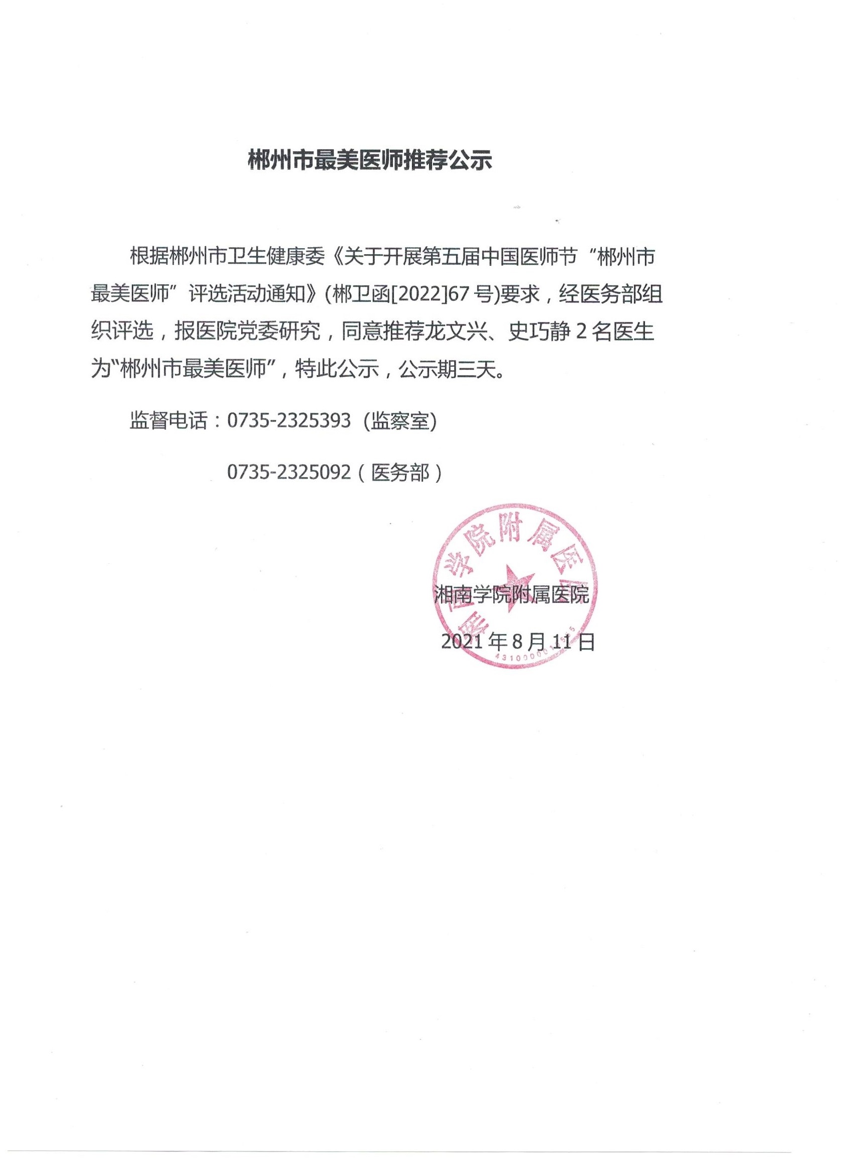 郴州市最美医师推荐公示