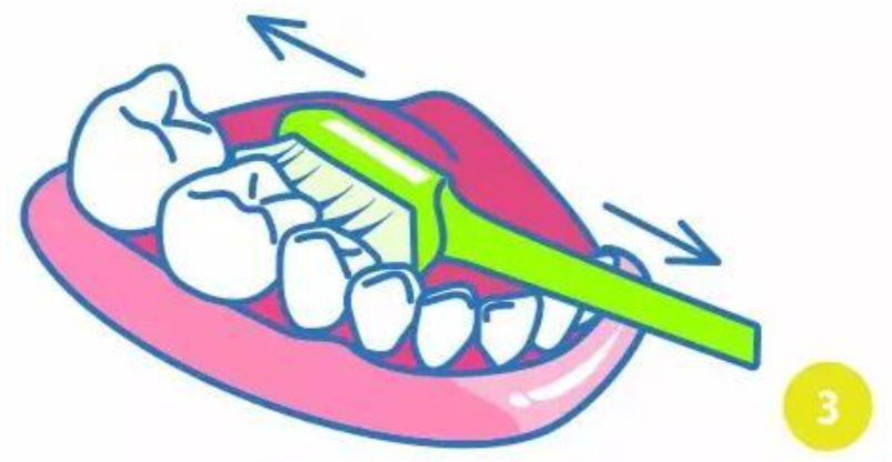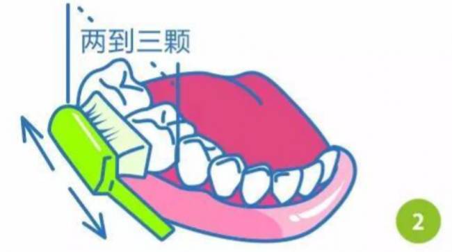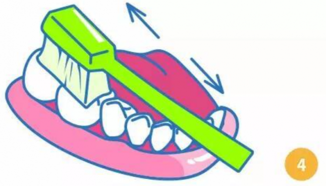 4、刷咬合面时,也是两颗牙两颗牙,来回的刷。咬合面上的天然窝沟不容易刷干净,要用力些刷。