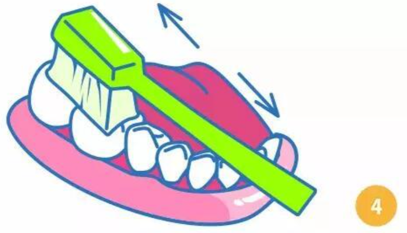 3、后牙的舌侧部分室较不易刷的地方,刷毛仍对准牙齿与牙龈的交界处,刷柄要贴近大门牙。