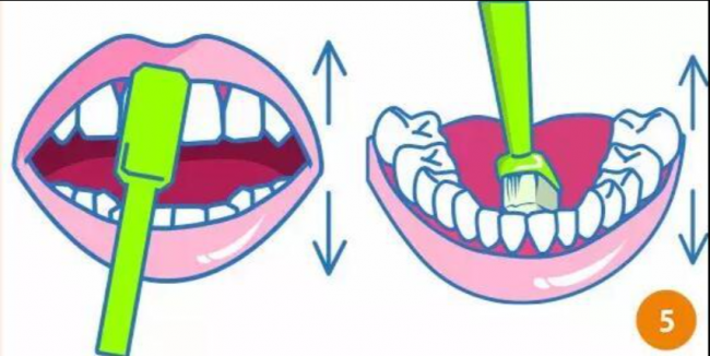 5、刷门牙时要把牙刷竖起来,一颗一颗的上下来回刷,内外都要刷到。