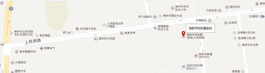 乘车路线:市内坐13、14、24、29、33、63路公交车到湘南学院附属医院站、湘南学院附属医院北站下车即达医院