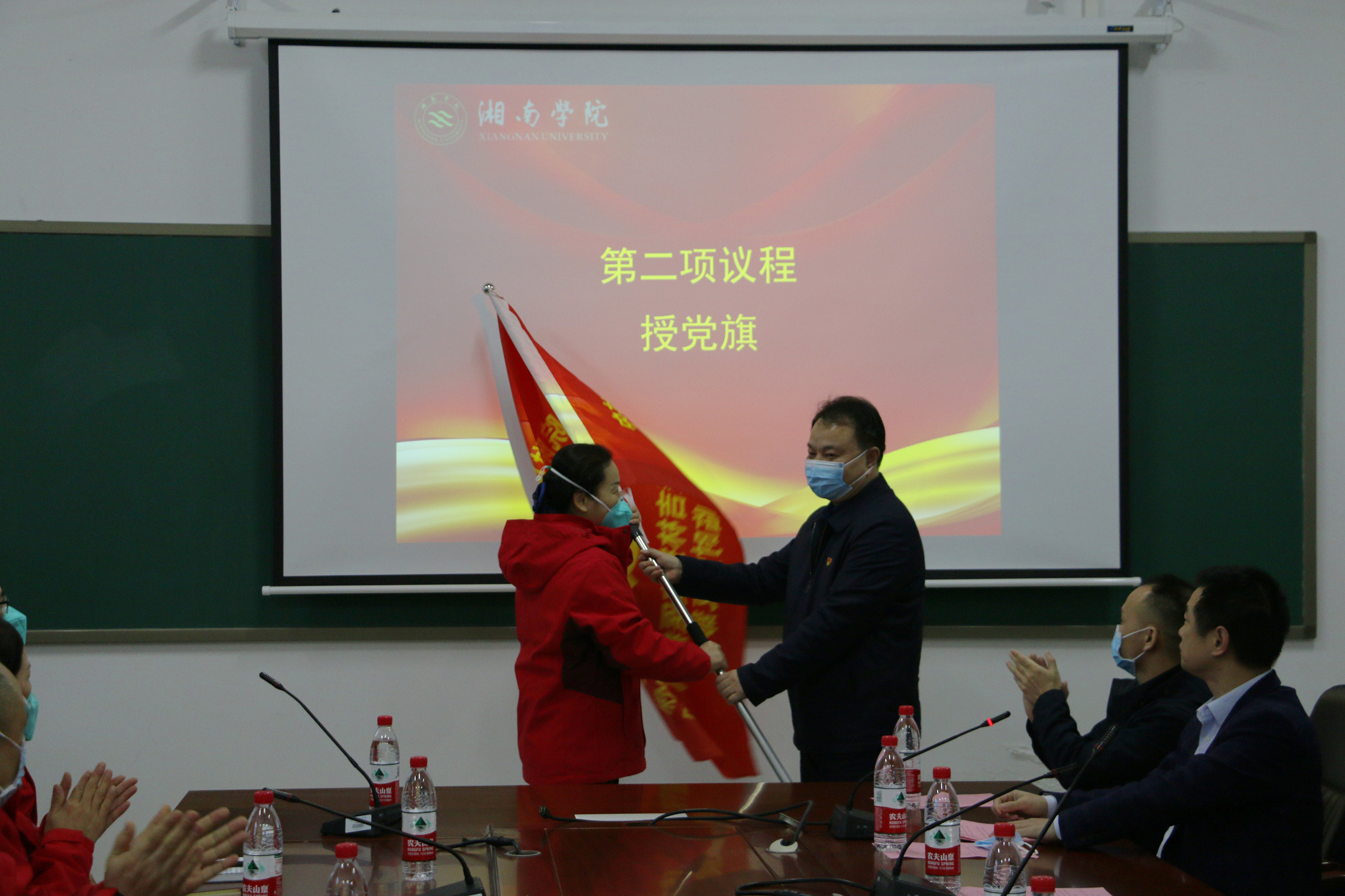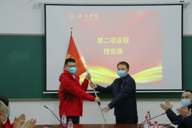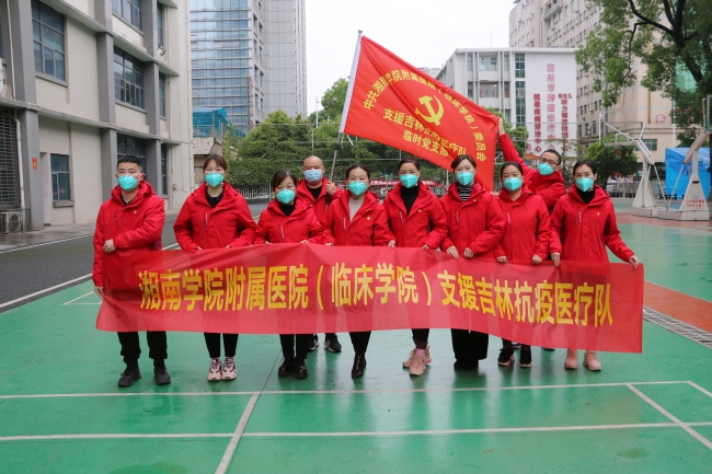 附属医院(临床学院)党委书记谭东辉分别为中共湘南学院附属医院委员会支援吉林省抗疫医疗队临时党支部和中共湘南学院附属医院委员会支援长沙市抗疫医疗队临时党支部授旗。
