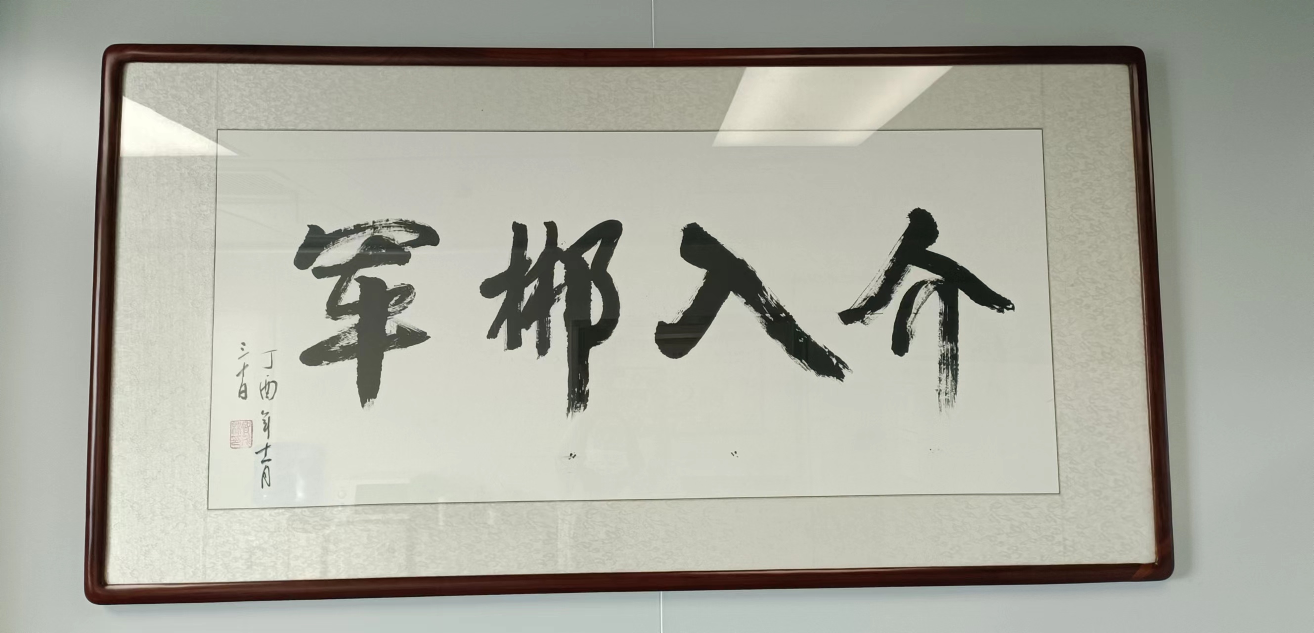 入门后一眼就看见了右侧光洁墙壁上的它,苍劲有力的四个大字“介入郴军”装裱的质朴简约。