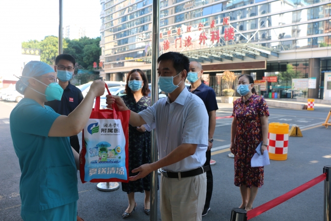 本网讯(通讯员 张媛)8月4日,我院开展“夏送清凉·情系职工”慰问活动,院领导为奋战在高温一线的工作人员送上王老吉、龟苓膏、菊花茶等防暑降温慰问品。