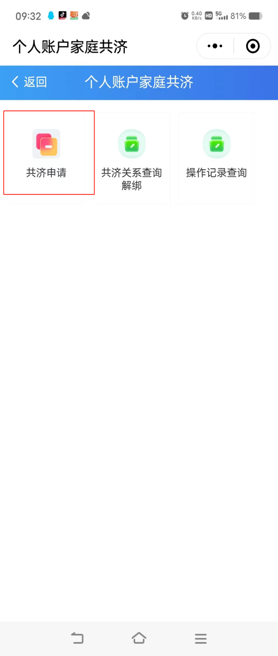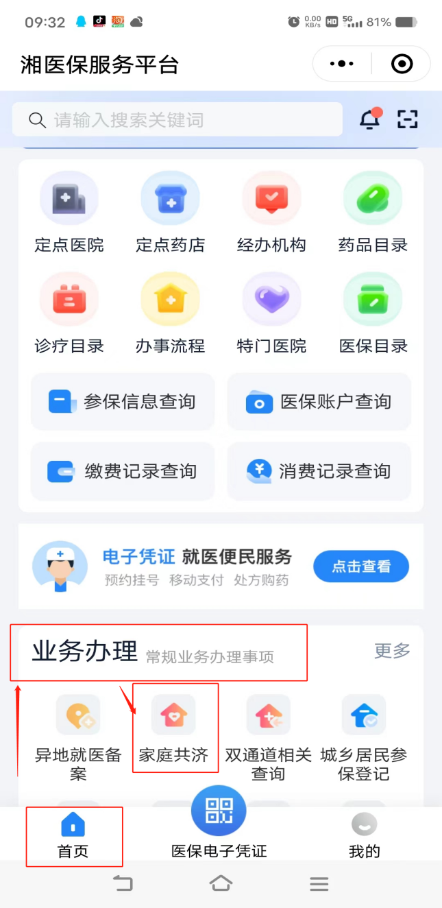 第一步:下载“湘医保”APP,或进入“湘医保”小程序,登陆后在首页→“业务办理”中找到“家庭共济”点击“共济申请”。