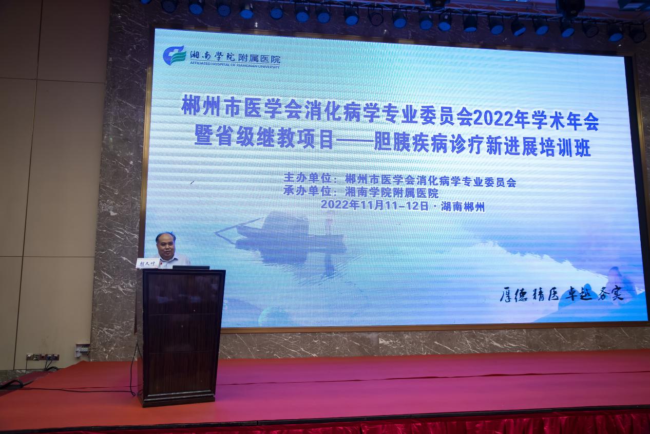 2022年11月11-12日,郴州市医学会消化病学专业委员会2022年学术会暨湖南省继续医学教育项目“胆胰疾病诊疗新进展”培训班顺利召开。本次年会由郴州市医学会消化病学专业委员会主办、湘南学院附属医院承办,委员会全体委员及来自全市及周边地区各级医疗机构从事消化内科、消化内镜及相关专业的180余名医师代表参加了本次会议。郴州市卫健委党委委员、副主任(兼)、市疾控预防控制局局长李跃辉及湖南省医学会消化病学专业委员会主任委员、湖南省人民医院消化内科主任杨瑜明教授出席开幕式并讲话。开幕式由郴州市医学会消化病学专业委员会主任委员、湘南学院附属医院消化内科主任胡久叶教授主持。