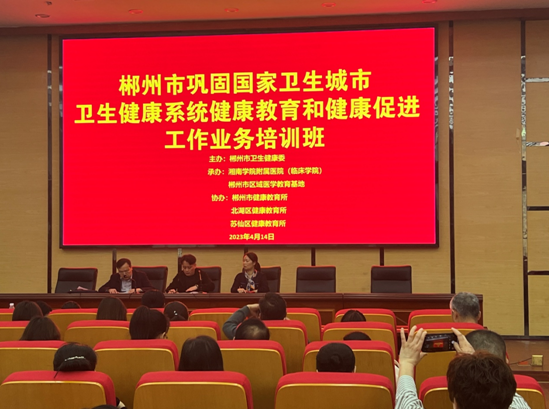 本网讯(通讯员 胡杨志 李瑛)4月17日,由郴州市卫生健康委主办,我院承办的郴州市巩固国家卫生城市卫生健康系统健康教育和健康促进工作业务培训班在湘南学院北湖校区学术报告厅顺利举行。